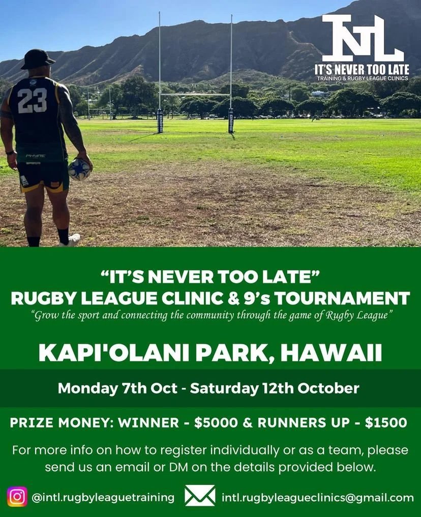 Get ready to pack your bags and hit the beach because LA Mongrel is heading to Hawaii for an unforgettable training camp hosted by It's Never Too Late Owner, Junior VaiVai. This exciting week-long event offers our players a unique opportunity to train alongside an NRL, Super League, and USA National Team player while soaking up the sun and surf of the Aloha State. With a thrilling 9s tournament on the horizon and $5K up for grabs, the stakes have never been higher. Join us as we dive into this one-of-a-kind experience and set our sights on victory!